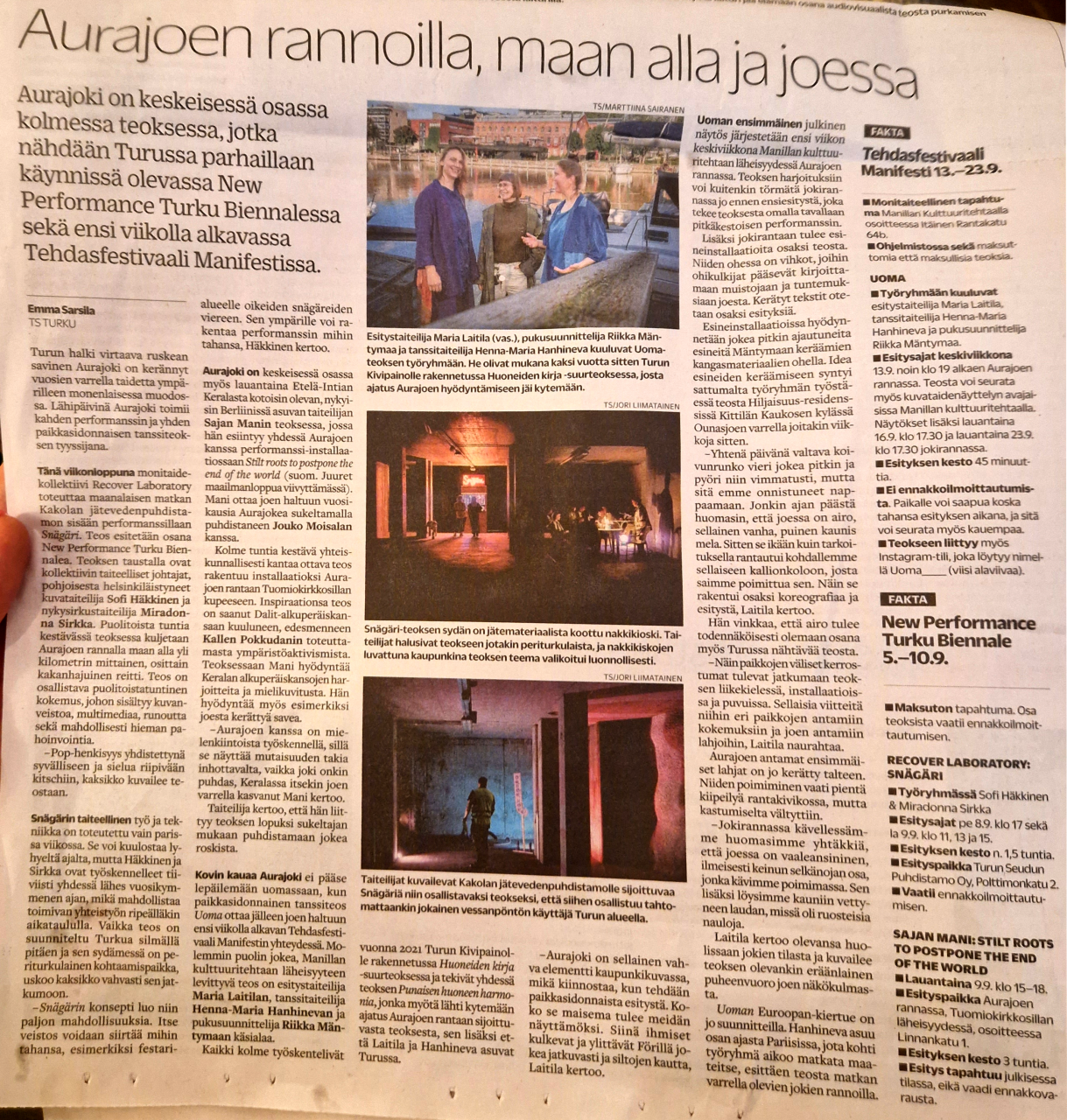 - 9/2023 Turun Sanomat, lehtijuttu Snägäri-performanssista New Performance Turku Biennalessa (tässä linkki ei-tilaajille)
