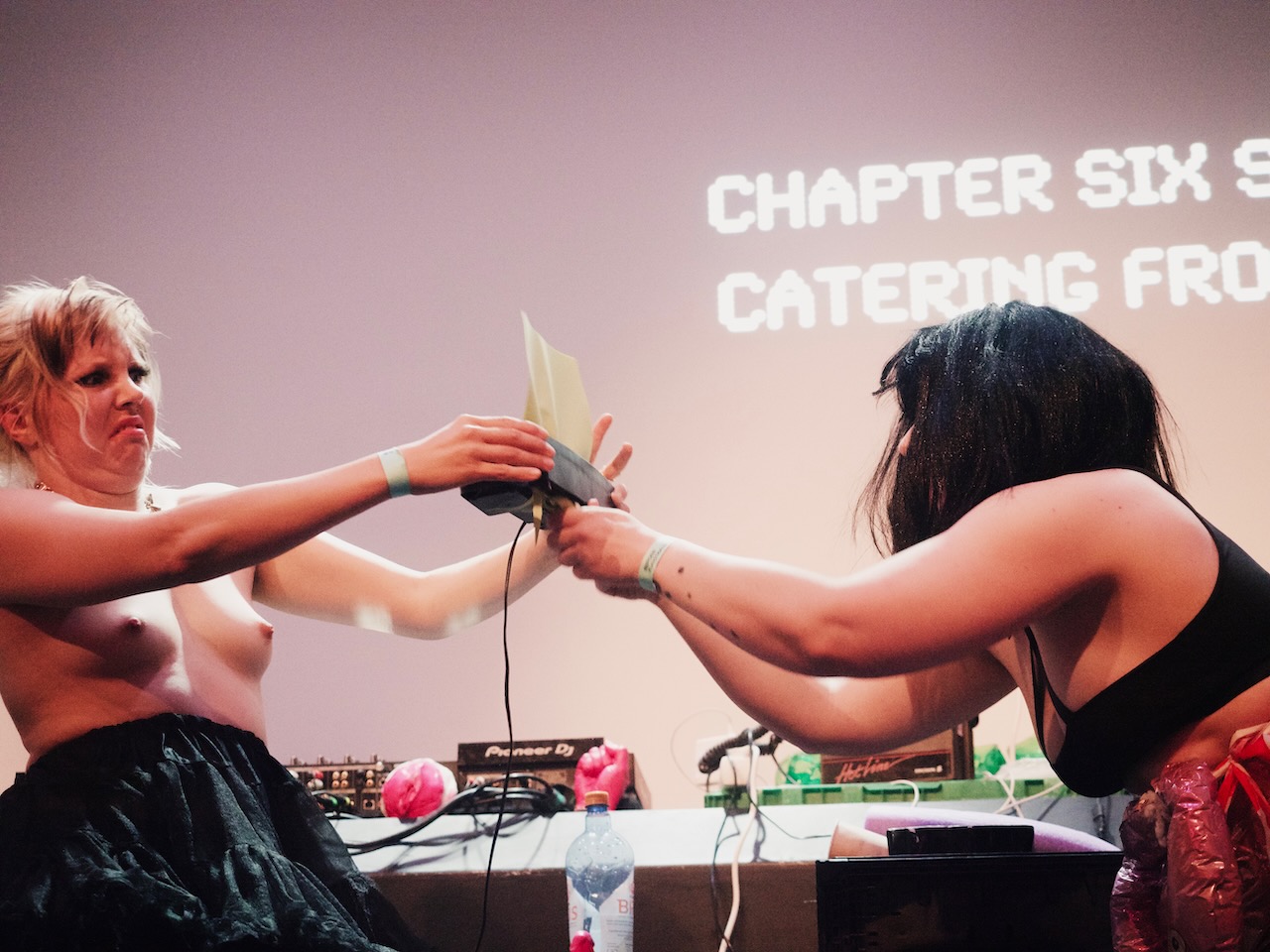 In the performance, the hypersexualization afab (assigned female at birth) bodies are subjected to in everyday life is made visible and reclaimed. The duo takes matters into their own hands with the imagery of popular culture, movies and music. The performance rises from pure enjoyment, even though one of the reasons for the piece is the many incidents when the artist’s work has been criticized for showing boobs on stage.