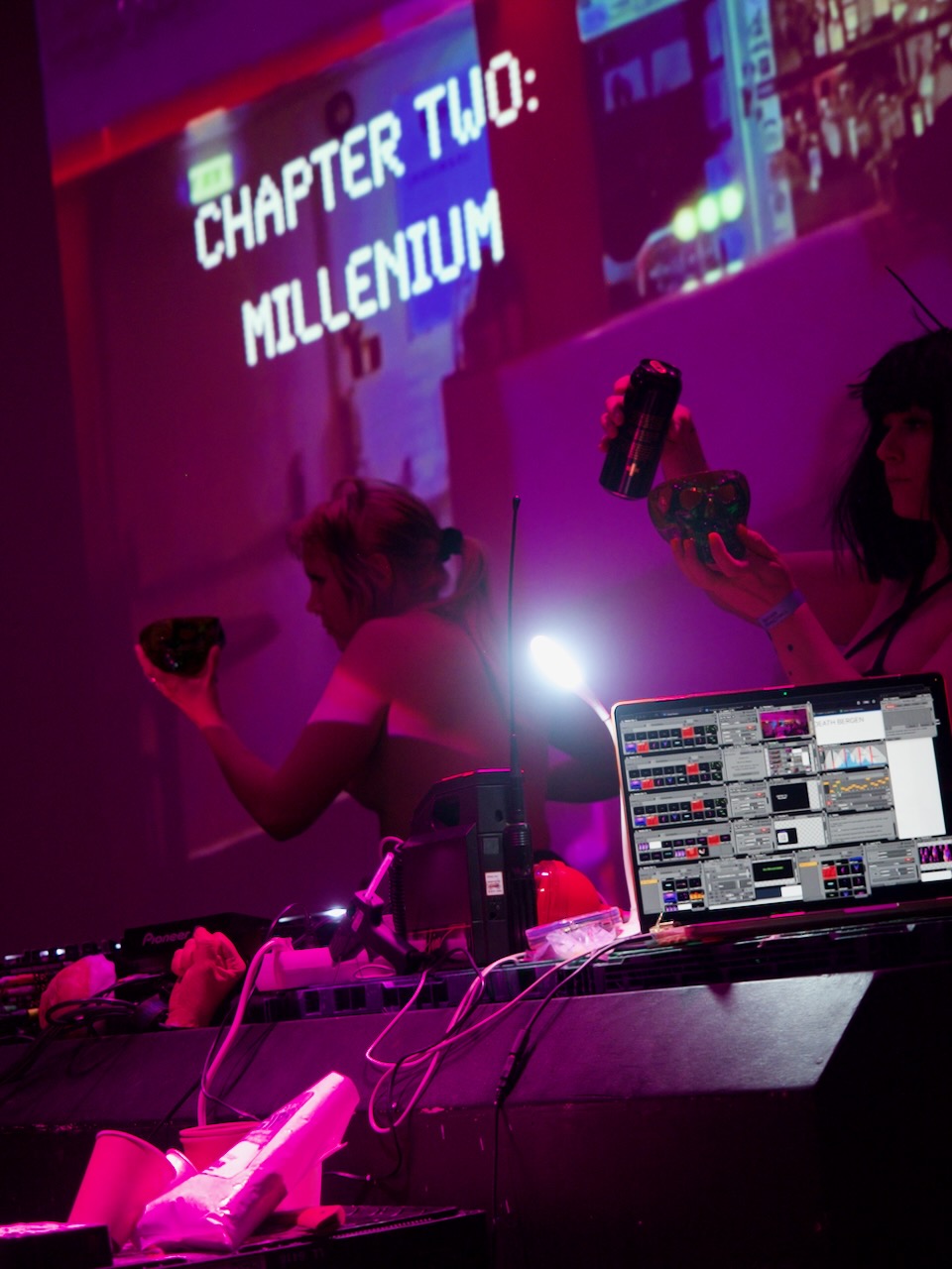 Sirkka and Häkkinen’s performance “the Life and Death” brings together elements of performance art, DJ & VJ gigs, and having grown up in the 00’s. The performance is a criticism of hetero- and mono-normativity, along with capitalistic perfectionism. Queerdos Häkkinen and Sirkka build a shared moment of fun, weirdness, horror, play, love and tears – simultaneously satirizing the coolness associated with club culture. They poured everything into this artwork: all the frustration, joy, sex, humor, broken hearts and other nasty shit from their souls. 😉